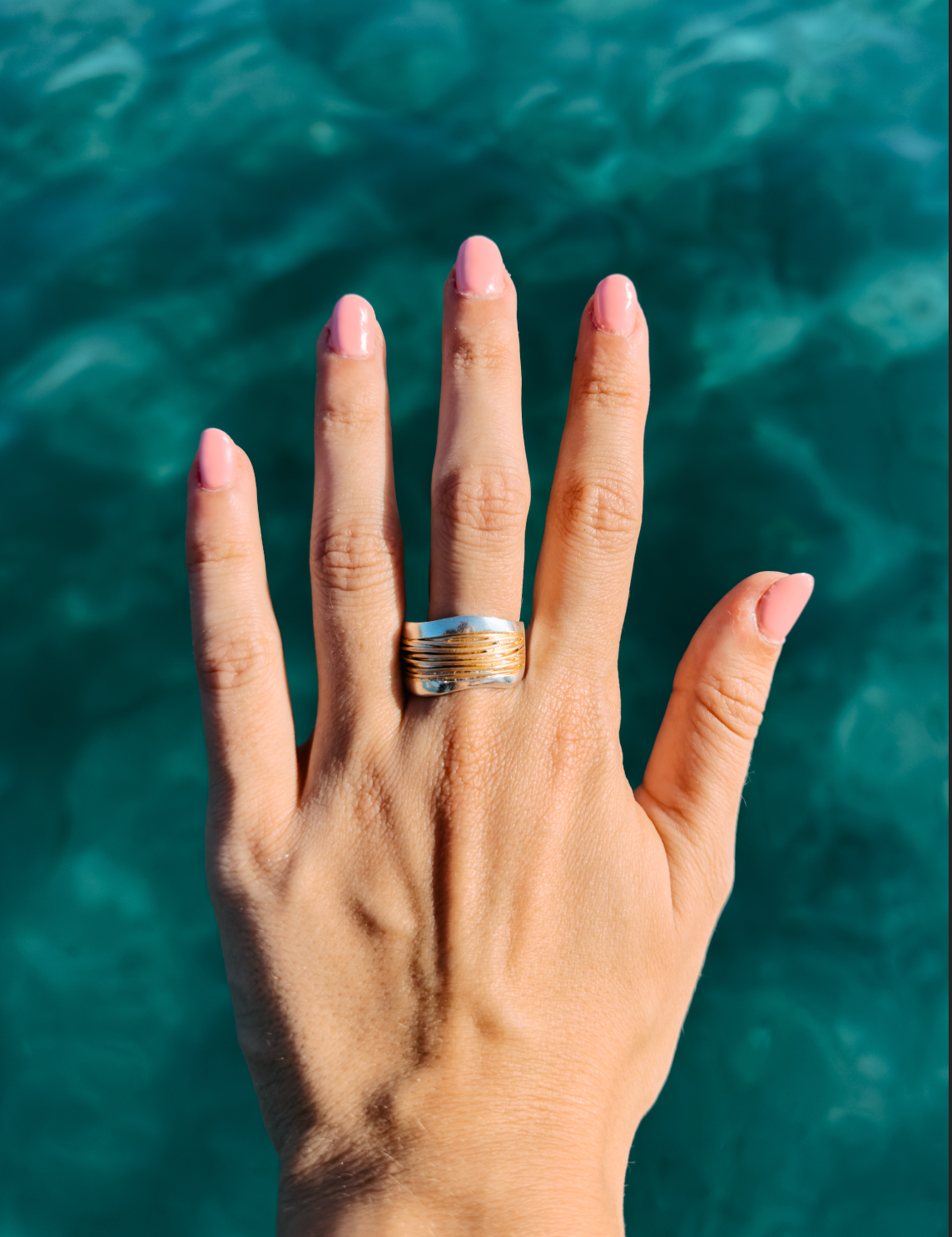 Este anillo es un impresionante testimonio de la elegancia moderna y la artesanía artística. Con una delicada combinación de plata brillante e hilos dorados, este anillo destaca como un accesorio extraordinario que realza cualquier estilo personal.