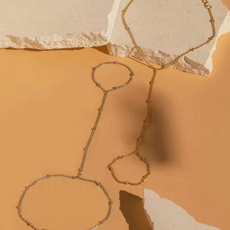 The Celestial Touch Luxe Hand Chain embodies an exquisite blend of celestial charm and timeless refinement. This stunning piece features a slender ring band that gracefully connects to a delicate bracelet, linked by a soft, luminous chain that rests lightly on the skin and follows the movement with every step.